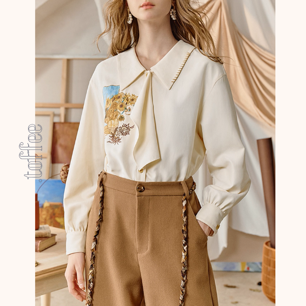 ゴッホの名作《ひまわり》をモチーフに、アップリケ刺繍で胸元に咲かせたアートシャツ。