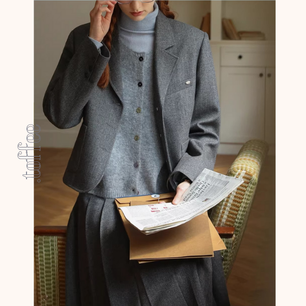 落ち着いたグレーが醸し出す知的なムードに、すっきりとしたシルエットが映えるスーツジャケット。両サイドには機能的なポケットを配置し、デイリーにもお仕事スタイルにも使いやすいデザインです。シャープすぎない柔らかな色味が、大人の余裕と上品さを引き立て、シンプルなコーデにも自然と“洗練された空気”をプラス。インナー次第でクラシックにもモードにも楽しめ、ベーシック派さんのワードローブにしっくり馴染む一枚です。