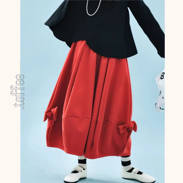 ころんと丸みを帯びたバルーンシルエットが魅力の主役級スカート。裾に向かってふんわり膨らみ、最後に軽く絞られる立体フォルムが、シンプルなトップスでも着映えを叶えます。両サイドにはリボンの可愛らしい結び目デザインをプラス。動くたびにちょこんと揺れて、遊び心のあるアクセントに。膝位置の水平切り替えが丸みを強調し、ボリュームと色の存在感をより引き立てます。ベーシックなスタイルにレトロ可愛いスパイスを添えたい日にぴったりの一枚です