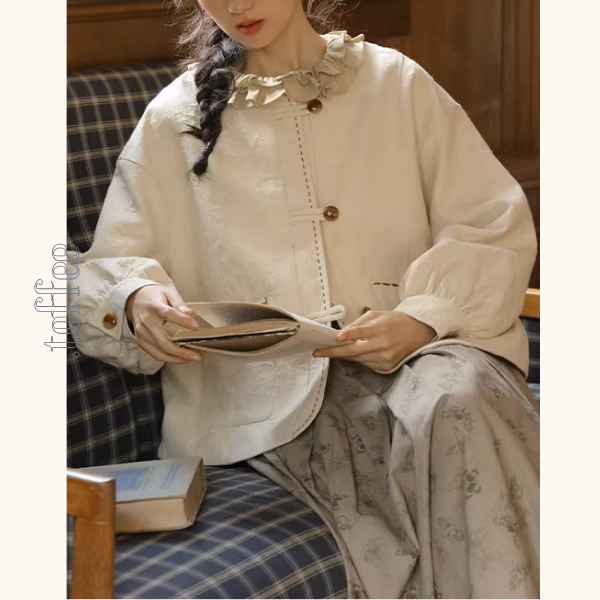 ころんと丸いフォルムと、さりげなく施されたステッチディテールが目を惹くショートジャケット。ナチュラルなアイボリーカラーに、木調のボタンが優しいアクセントを添えます。クラシカルでありながらどこかモダンな印象も感じさせる一着は、ワンピースにもスカートにも合わせやすく、季節の変わり目にぴったり。ベーシックに少しの遊び心を加えて、毎日の装いをほんの少しだけ特別に。レトロと今っぽさが溶け合う、そんな一枚です。