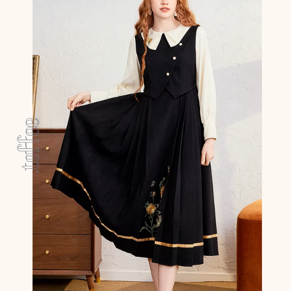 オフホワイト×ブラックのバイカラーが凛と美しい、エレガントなシャツワンピース。襟と袖に潔い白を配し、ボディ部分を深いブラックで引き締めたクラシカルな一枚です。胸元には斜めラインに走るボタンをあしらい、さりげない個性をプラス。さらに右襟とフロント裾近くには、ゴッホのヒマワリを思わせる刺繍がそっと咲き、大人の装いにアートの香りを添えてくれます。軽やかなプリーツが歩き姿を美しく見せ、ベーシックの中に“自分らしさ”をひとしずく落としたような、当ショップらしい特別感を楽しめるワンピースです。