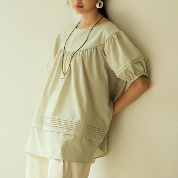 柔らかなトーンのナチュラルカラーが魅力のギャザーブラウス。 胸元から肩にかけての切り替えと、ふんわり広がるシルエットが女性らしい柔らかさを演出します。 横プリーツのデザインがアクセントになり、シンプルながらも存在感のある一枚に。 ゆったりとした着心地で体型をさりげなくカバーしながら、涼しげで優しい印象を与えてくれます。