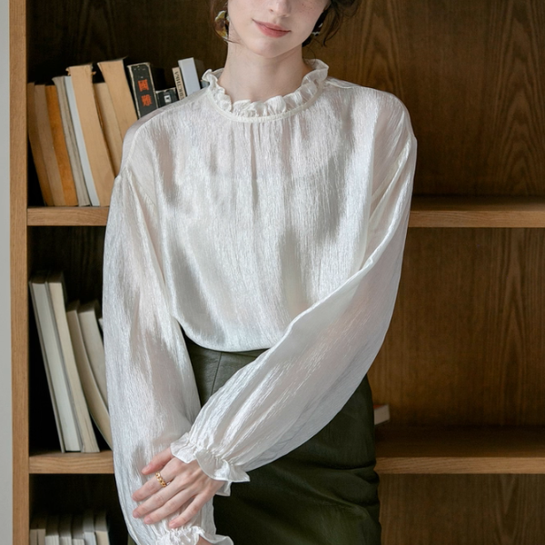 繊細な透け感が美しいシアー素材に、首元と袖口のフリルをあしらったホワイトブラウス。上品さの中にほんのりレトロな可愛らしさが漂い、シンプルなボトムスと合わせるだけで洗練された印象に。オフィスシーンから特別な日のお出かけまで幅広く活躍し、装いに軽やかな華やぎを添えてくれます。大人の女性にふさわしい、品と遊び心を両立した一枚です。