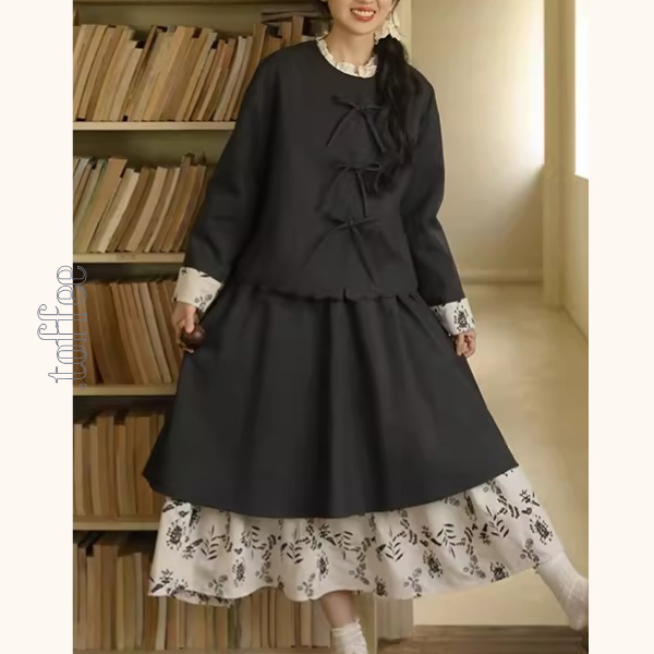 リボン留め×レイヤード風ブラックセットアップ《Z01358》