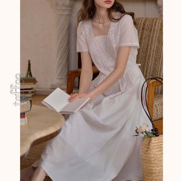 繊細なレース刺繍をあしらったスクエアネックが上品なロングワンピース。真っ白な生地に控えめな透け感が涼しげで、軽やかな装いを叶えてくれます。ウエストはリボンで調整でき、女性らしいシルエットを演出。シンプルながらもクラシカルな雰囲気を纏い、特別なお出かけや日常のひとときも優しく彩ります。