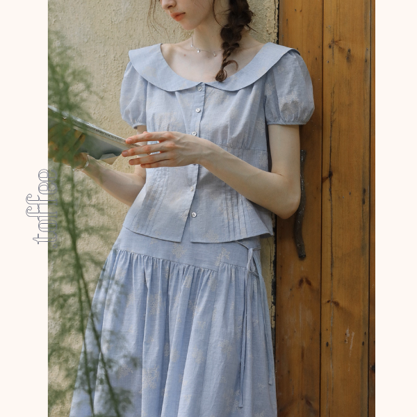 深めのの丸襟とパフスリーブが可憐な印象を与えるブルーワンピース。淡いブルーの生地に繊細な模様が散りばめられ、涼しげで上品な雰囲気を演出します。ウエストから広がるギャザーのスカートは、歩くたびにやわらかく揺れ、女性らしいシルエットを引き立てます。日常の装いにはもちろん、週末のお出かけやリラックスした時間にもぴったり。クラシカルなディテールが日常に小さな特別感を運んでくれる一枚です。