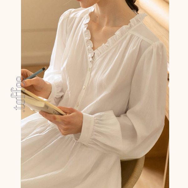 静かな朝の光に包まれるような、やわらかく透明感のあるホワイトワンピース。繊細なフリルの襟が上品さを添え、すとんと落ちるAラインシルエットが大人の余裕を感じさせます。ゆったりとした袖は、日常の中に穏やかな幸福を運んでくれるデザイン。かごバッグや革靴との相性も抜群の一着です。