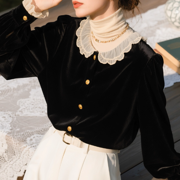 しっとりとした光沢を放つブラックに、ゴールドボタンが美しく映えるレトロシャツ。ハイネックの襟元と袖口にはベージュの切り替えが施され、上品なコントラストが印象的。