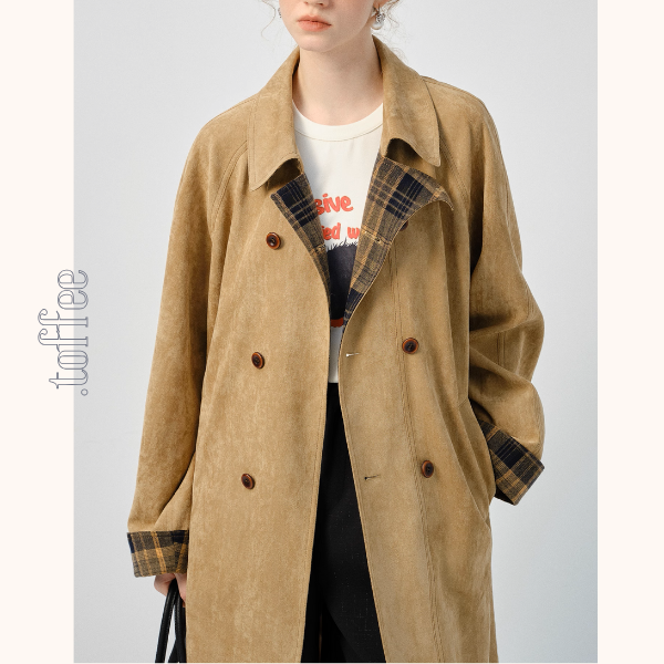 大人レトロに映えるチェック袖口のカーキトレンチコート《Z01182》