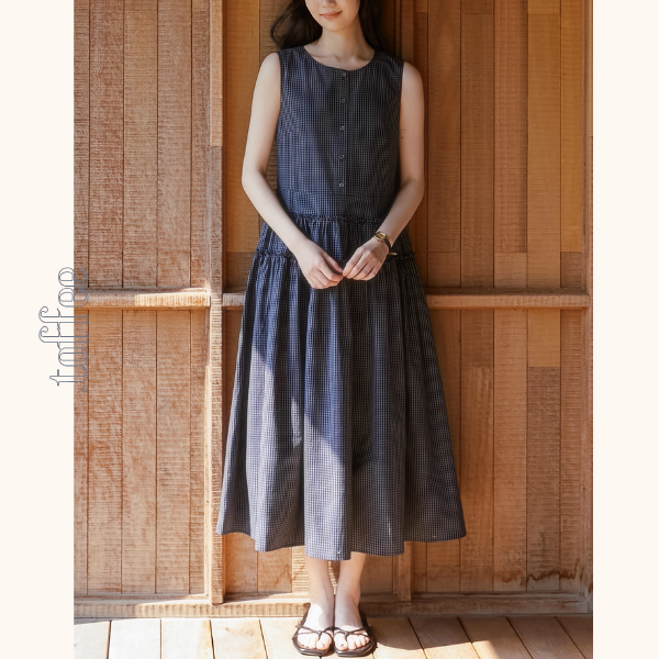 落ち着いたネイビーに細かな格子柄をのせたロングワンピース。すっきりとしたノースリーブに小さなボタンが並び、クラシカルで端正な印象を与えます。切り替えから広がるスカートは動くたびに軽やかに揺れ、静かな中にも奥行きのある表情を演出。カーディガンを羽織れば日常のお出かけに、アクセサリーを添えれば特別な時間にも寄り添う一枚です。シンプルながら個性を感じるデザインで、着る人の雰囲気を引き立てます。