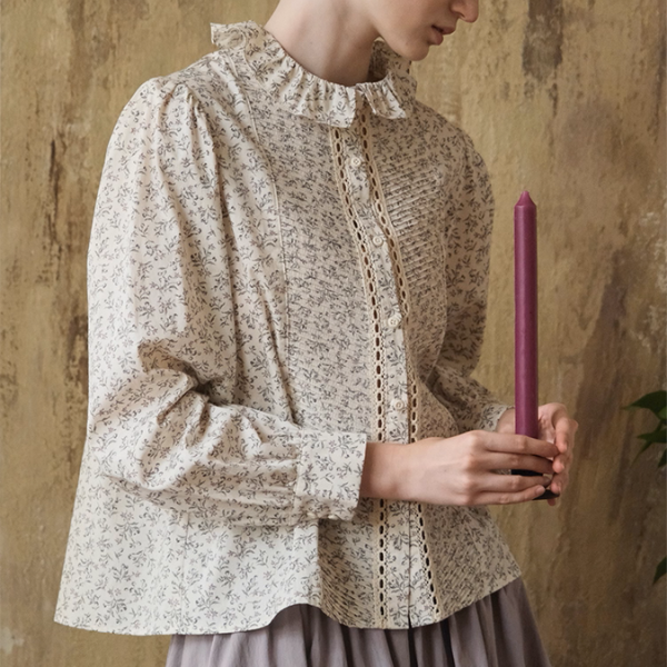 繊細な小花柄にフリル襟を添えた、シックな雰囲気漂うブラウス。 フロントにはレースのような透けかし編みディテールを施し、さりげなく可憐な表情をプラスしました。 ゆったりとしたシルエットとふんわり袖が上品な空気を纏い、一枚で存在感のあるスタイルに。 スカートと合わせればレトロフェミニンに、デニムでカジュアルダウンも苦にさせて頂きます。