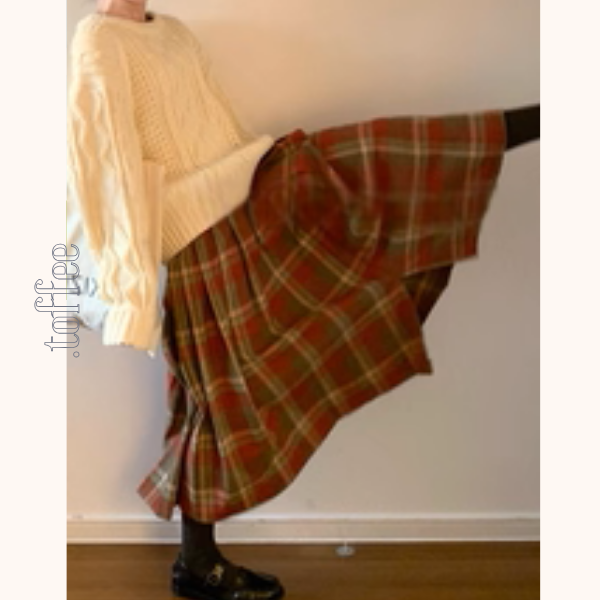 ふわっと広がるプリーツに、レトロなオレンジとグリーンのチェック柄をのせたロングスカート。 歩くたびに軽やかに揺れるシルエットが上品で、どこか懐かしい雰囲気をまとわせてもらえます。 シンプルなトップスを合わせるだけでコーデが華やぎ、季節限定で活躍する一枚。
