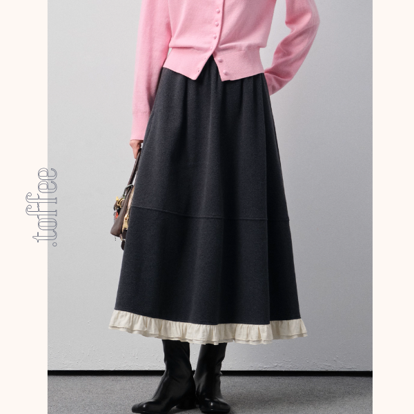 深みのあるチャコールに、裾へそっと添えた白レースがクラシカルなムードを漂わせるロングスカート。