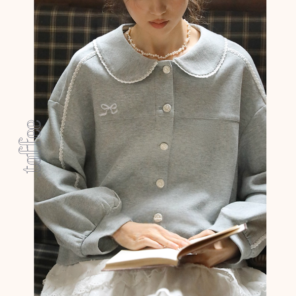 小さなリボン刺繍とレースステッチがさりげなく彩る、クラシカルで愛らしいグレーカーディガン。パール調のボタンや丸襟が柔らかな印象を添え、大人の可愛らしさを引き立てます。落ち着いたカラーに、レトロ可愛いディテールが映える一枚です。シンプルながらも世界観のあるデザインは、ナチュラル派さんやアンティーク好きさんにもおすすめ。お気に入りのスカートやワンピースと合わせて、日常にほんの少しのときめきを。