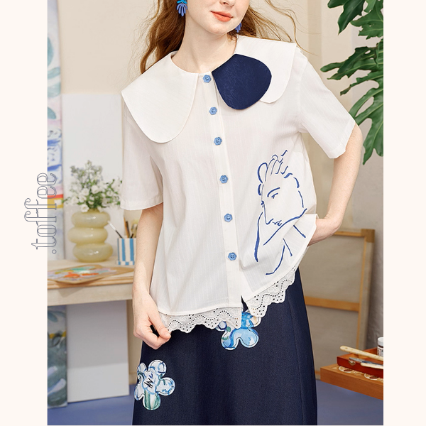 繊細な線画プリントと、裾にあしらわれたレースの縁取りが目を惹く、大人のためのアートシャツ。ゆったりとしたシルエットに、丸襟とセーラーカラーの遊び心が加わり、クラシカルで可憐な佇まいに。まるで一枚の詩のように、着る人の感性をそっと映し出します。ボタンのブルーもアクセントに。ベーシックでありながら“ちょっと個性的”を楽しめる、大人可愛い一着です。