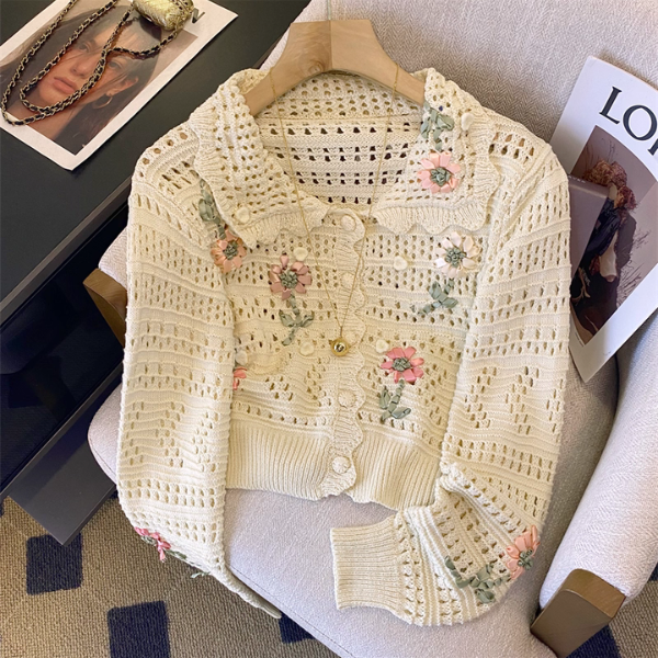 繊細な透かし模様が美しいメッシュ編みのカーディガン。