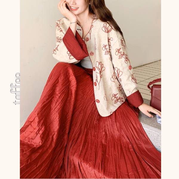 優雅な花刺繍が施されたトップスと、艶やかな赤のプリーツマキシスカートがセットになった一着。袖口や裾のディテールにも遊び心が宿り、レトロな中に凛とした美しさが漂います。大胆ながらも品のある配色が印象的で、一歩踏み出すたびに揺れるスカートが視線を惹きつけます。