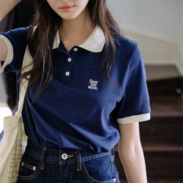 シンプルな遊びの中に心を添えた、大人のためのポロシャツ。 ネイビーをベースにした上品なカラーに、襟と袖の決まりデザインがアクセントにもプラス。 胸元には「Over the Moon」の刺繍をあしらい、さりげない個性を演出します。 デイリー使いはもちろん、休日のお出かけやカジュアルなオフィススタイルで活躍します。 スカートとも相性が良く、大人の女性にぴったりな一枚です。