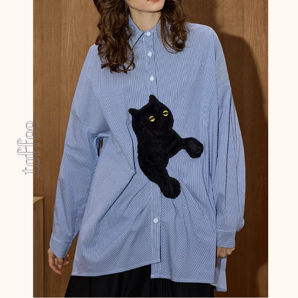 遊び心たっぷりの黒猫アップリケが目を引くストライプシャツ。柔らかなブルーのストライプに、立体的な黒猫のモチーフがアクセントとなり、大人のカジュアルスタイルにユーモアを添えてくれます。オーバーサイズのシルエットで抜け感があり、デニムやワイドパンツとの相性も抜群。シンプルな中にひとさじの個性をプラスし、デイリーから特別なお出かけまで幅広く活躍します。