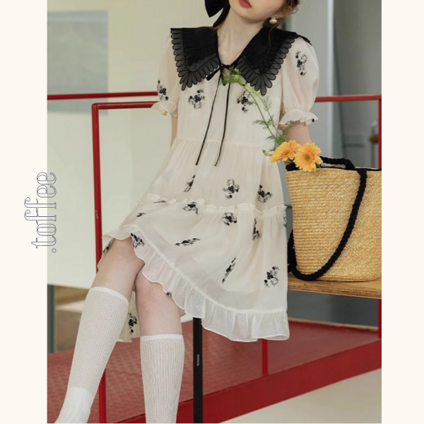 クラシカルな黒いスカラップ襟と繊細な花柄プリントが調和する、レトロモダンなワンピース。軽やかな生地にふんわりと広がるシルエットが、可憐さと品のある存在感を演出。ふくらみを持たせた袖やティアード切り替えのデザインが、日常を少しドラマチックに彩ります。一枚で主役になるのはもちろん、バスケットバッグやソックスと合わせて甘さを引き立てたり、シンプルな小物でシックにまとめても素敵です。