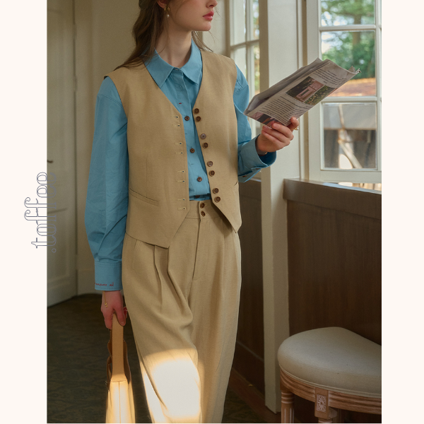 レトロな雰囲気漂うシングルブレストベストとハイウエストワイドパンツのセットアップ。