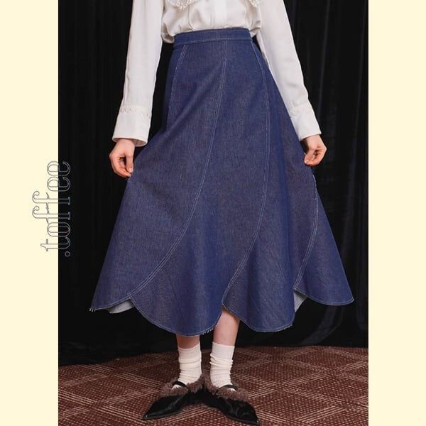 レトロな魅力が息づくこのデニムスカートは、まるで花びらが舞い降りたかのような独特のデザインが特徴です。