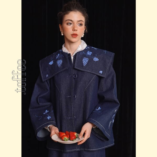 特筆すべきは、葡萄の刺繍が美しく施されたセーラーカラーの大きな襟。このユニークなデザインが、どことなく古き良き時代を彷彿とさせます。