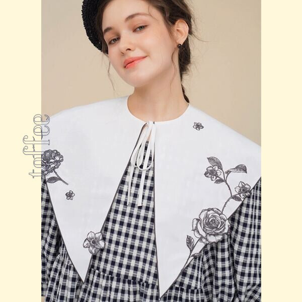 エレガントなガーリーテイストを引き立てるこのつけ襟は、繊細なバラの刺繍が施されたユニークな形が特徴です。