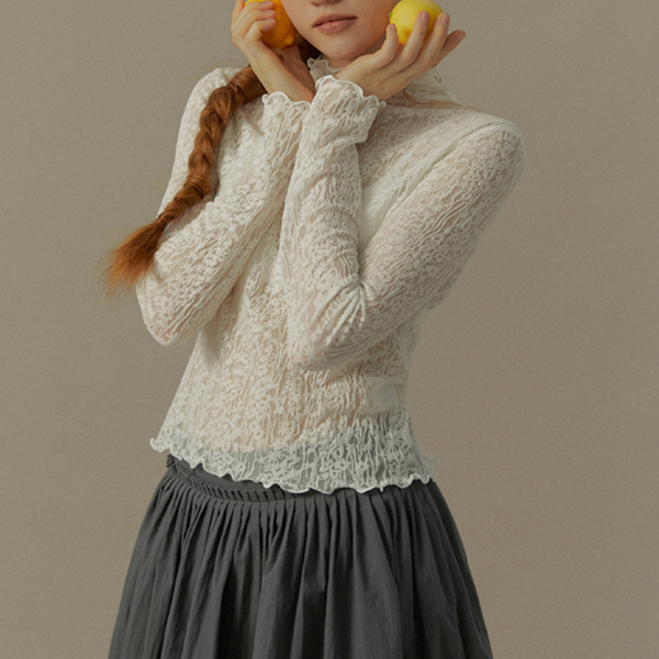 エレガントでありながらも、軽やかな印象を与えるメッシュレースハーフハイネックトップ。