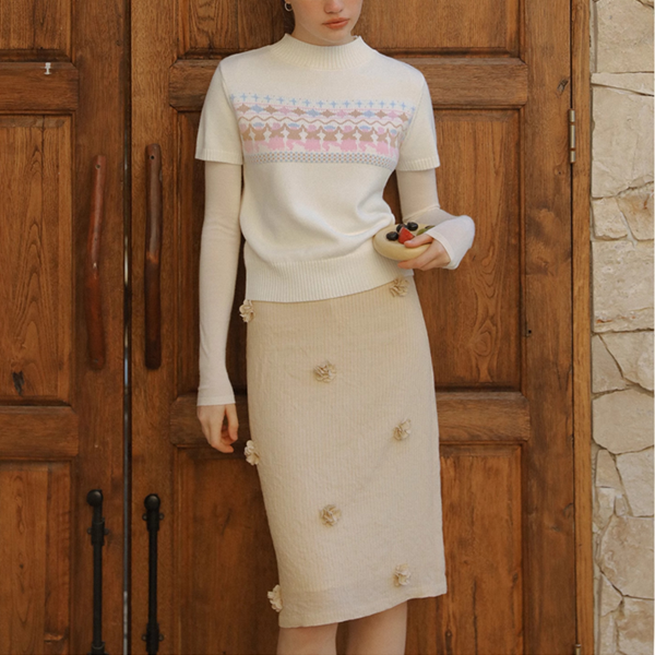 立体的なフラワーモチーフが散りばめられた、Aラインシルエットのスカート。