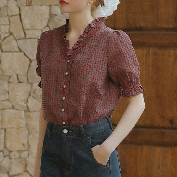 フリルネックチェック柄ブラウス《Z00822》