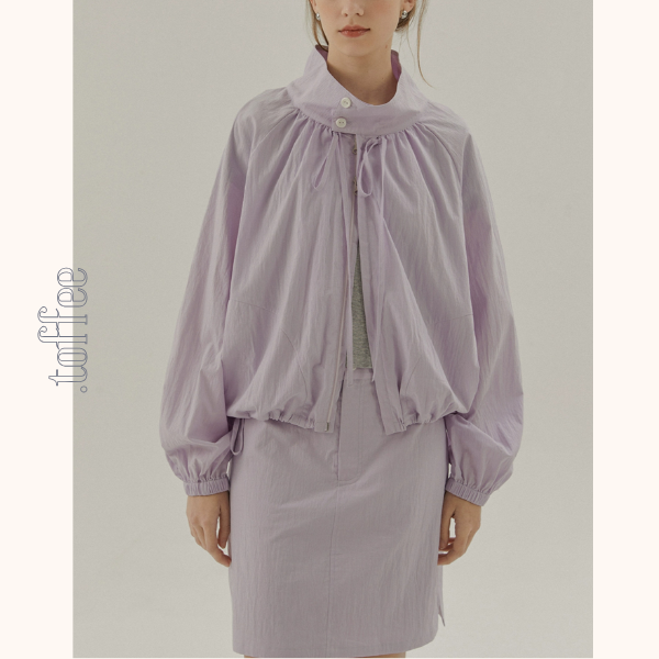 スタンドカラーとドロップショルダーのデザインが、女性らしいやわらかなシルエットを演出するジャケット。