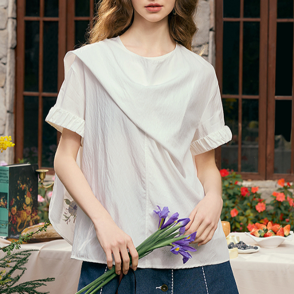 花柄刺繍がさりげなく施された、ホワイトカラーのシャツ。