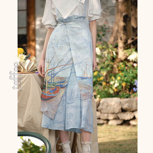 西洋絵画の巨匠ゴッホの『サント=マリーの浜辺の釣り船』をプリントした、イレギュラーなラップスカートです。