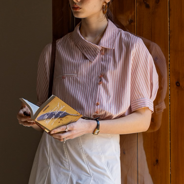 ストライプ柄が洗練された印象を与え、どんなボトムスとも相性抜群です。オフィスでの着用や、休日のカジュアルスタイルにもおすすめ♡