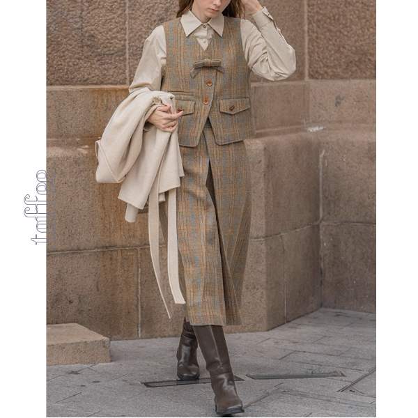 チェック柄リボン装飾ジレとミモレ丈プリーツスカートのセットアップ。