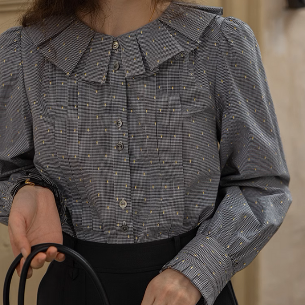 フリルの襟とフロントのプリーツが特徴の上品なロングスリーブブラウス。可愛らしい小麦の穂が描かれたデザインと、エレガントな夜空をイメージしたデザインの2種類を展開しています。上品なスカートともカジュアルなデニムとも合わせやすい万能なアイテムです。