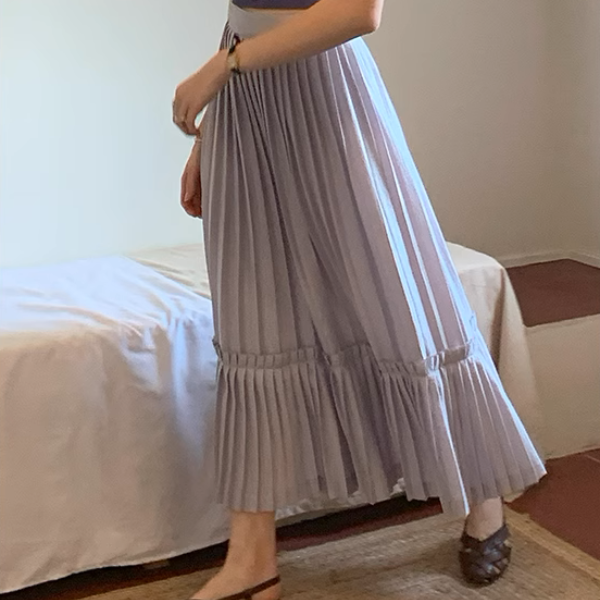 上品なプリーツとティアードデザインが美しいロングスカート。落ち着いた色合いが、大人の女性らしさを演出します。絵を描く時間、お散歩、カフェなど様々なシーンで大活躍♡着るだけで気分を上げてくれる、そんな特別なアイテムです。