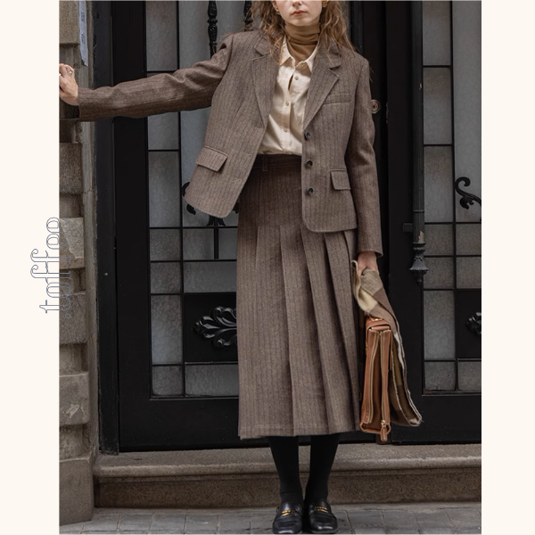 ストライプテーラードジャケットとロングプリーツスカートのセットアップ。ブラウンベースに繊細なレッドのストライプが施されており、上品で洗練された印象を与えます。ウール素材が優れた保温性を誇り、秋冬のスタイルにぴったり。ビジネスシーンからカジュアルなお出かけまで幅広く活躍する、万能な上下セットです。