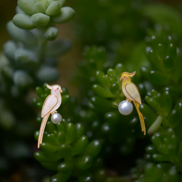パールの上に優雅に乗るオウムモチーフピアス。華やかなデザインが耳元を引き立て、おしゃれのアクセントにぴったりです。軽やかな印象を与えつつ、存在感のあるアイテムとしてどんなコーディネートにも嬉しいスパイスを加えます。