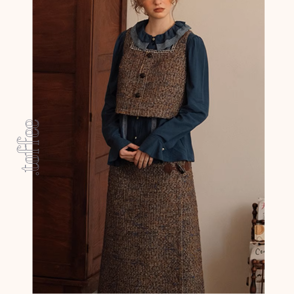 スクエアネックデザインのショートベストとホーンボタンがアクセントのロングスカートのセットアップ。