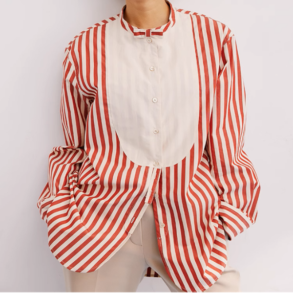 存在感抜群のバンドカラーストライプロングシャツ。レッドとホワイトのストライプが目を引き、洗練されたスタイルを演出します。個性を主張できるデザインで、カジュアルなデニムやスカートとも相性が良く、デイリールックを華やかに演出してくれます。