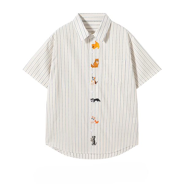 縦ストライプのすっきりとしたデザインに、カラフルな猫の刺繍がアクセントになったショートスリーブシャツ。