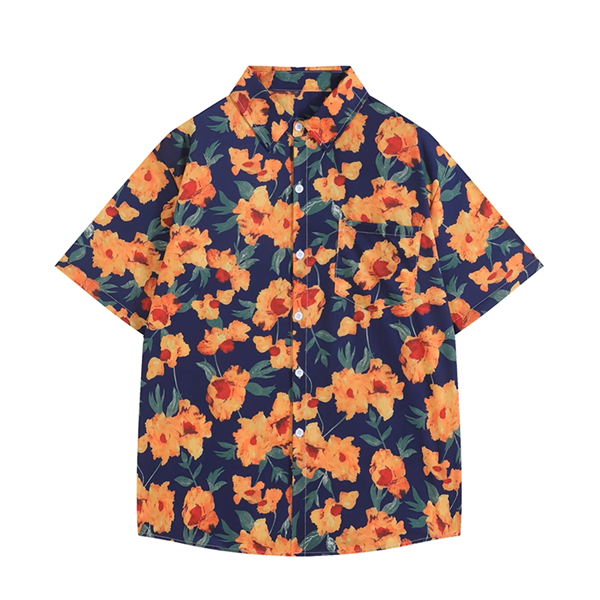 ネイビーをベースにオレンジの花々が咲き誇る半袖シャツ。