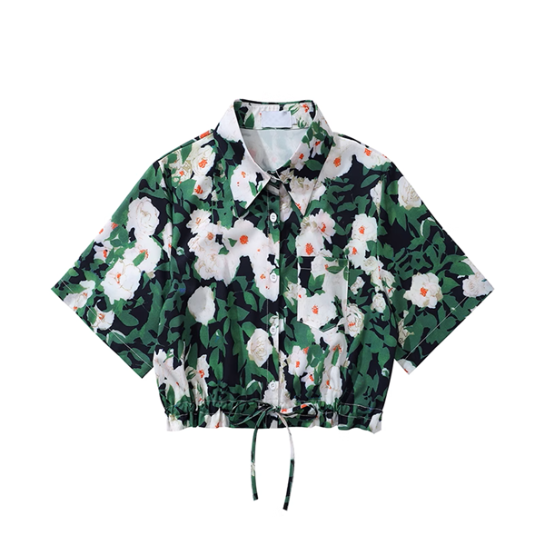 グリーンベースに白い花々が映える、クロップド丈のシャツ。爽やかなデザインで、夏の装いを軽やかに演出します。ボタンを留めてきちんとスタイルにも、ボタンを開けてラフな着こなしにも対応できる汎用性の高さが魅力です♡