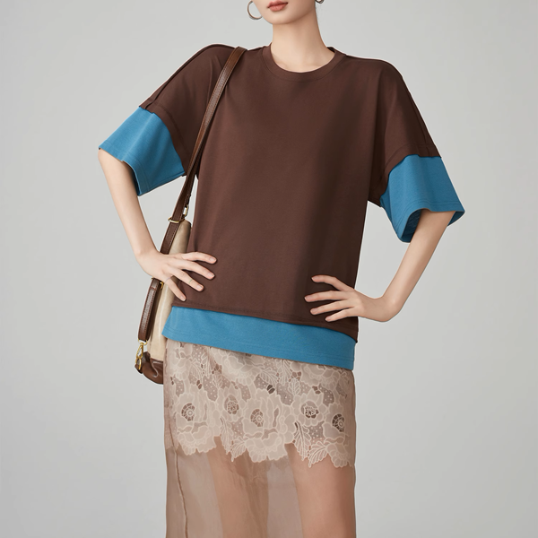 ブルーとブラウンのバイカラーが洗練された印象を与えるルーズトップス。レイヤード風デザインが着こなしに奥行きを与え、シンプルなボトムスと合わせるだけでおしゃれなスタイリングが完成します。