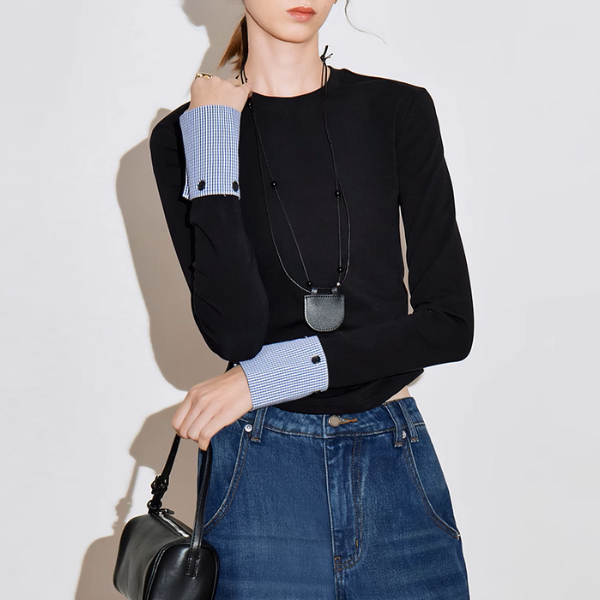 クルーネックのシンプルなトップスでありながら、カフス部分のギンガムチェックがさりげないアクセントになっています。