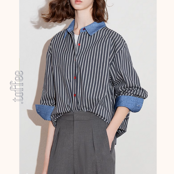 デニムカラーの切り替えがアクセントになったストライプシャツ。オーバーサイズのシルエットが、リラックス感を演出します。すっきりとした縦ストライプと、さりげないデニム使いが、着こなしにこなれ感をプラス。ほんのりマニッシュでオシャレな一枚です♡