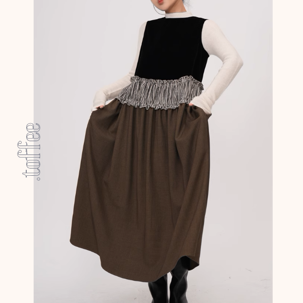個性とテイストを追求する女性に最適なノースリーブワンピース。チェック柄の切替デザインがアクセントとなっており、存在感を放ちます。スカートはダークブラウンのロングスカート。裾がゆったりとしたAラインになっており、上品で洗練された印象を与えます。