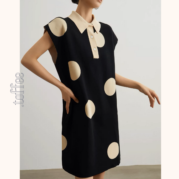 ラージドットとポロカラーがユニークに響き合う、フレンチスリーブのミニワンピース。ブラックのニット生地に施された大きなドットが、シンプルながらもオシャレな雰囲気を演出します。カジュアルなスニーカーとも相性抜群で、軽やかな美しさを楽しんでいただけますよ♪